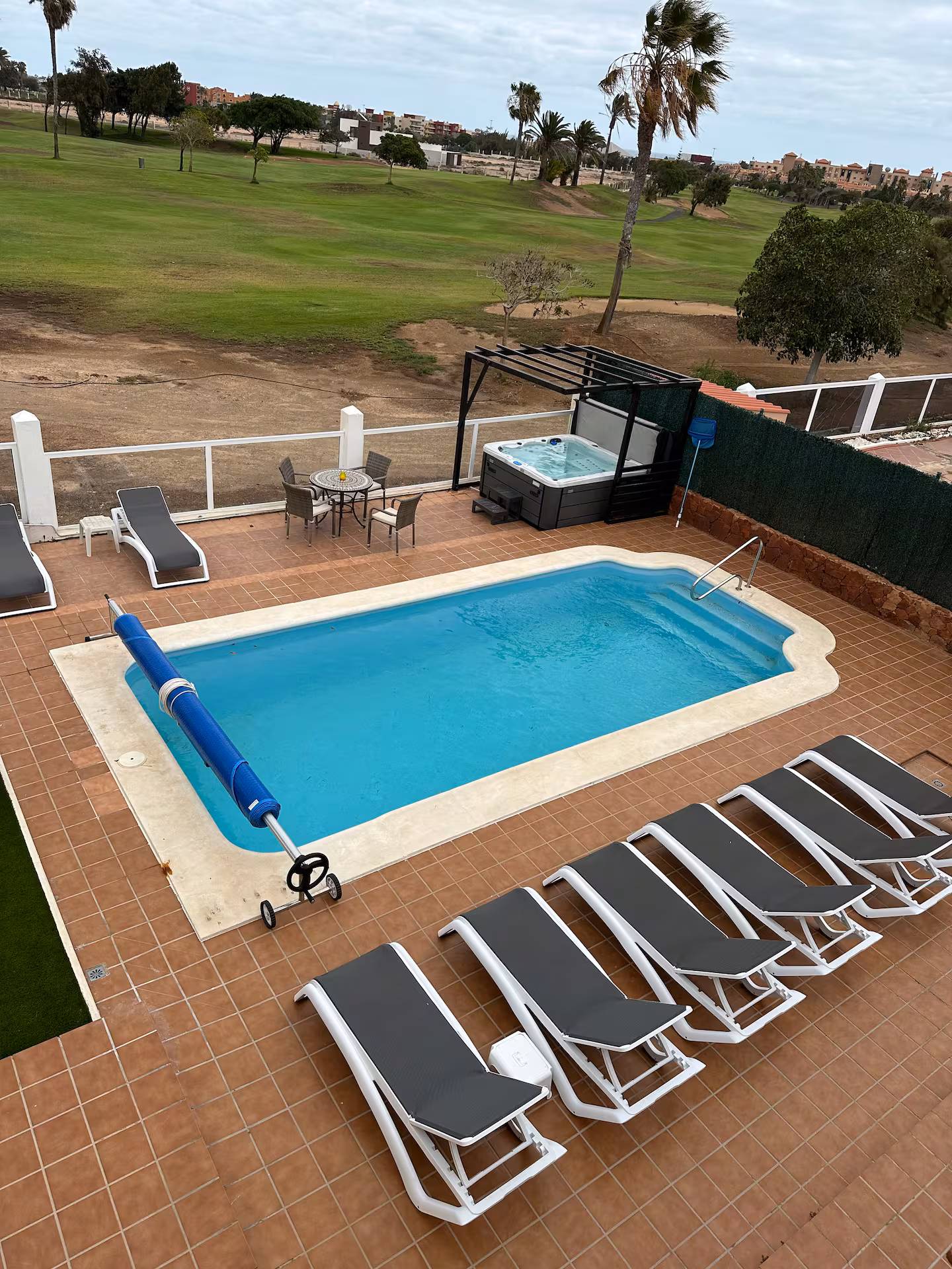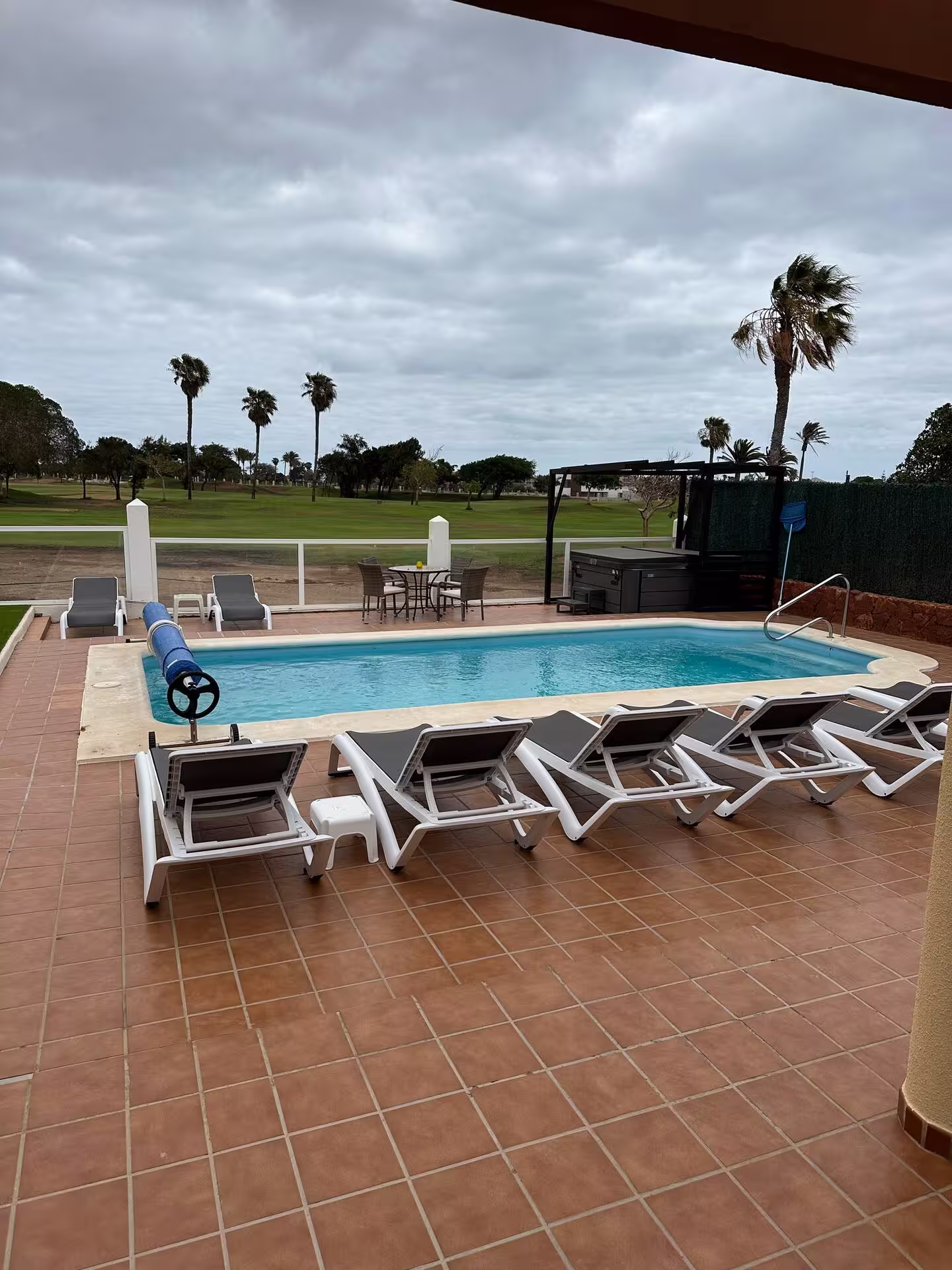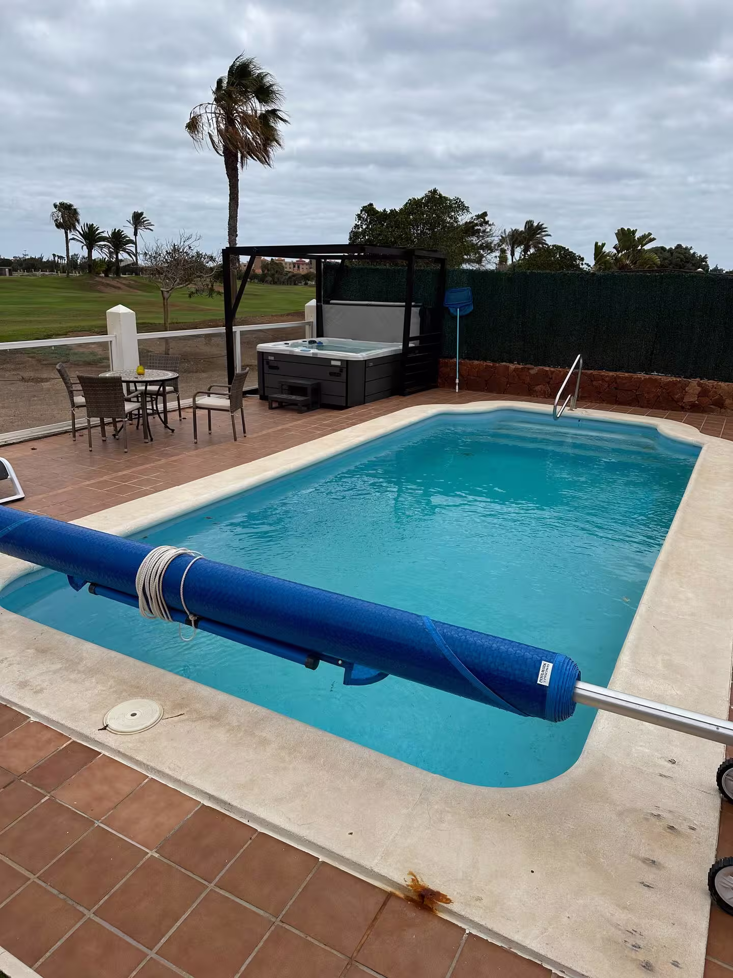 Heated Jacuzzi ( new in 2025) above ground. Canarian BBQ , seating for 8, sunbeds for 8. Extra seating on BBQ Patio and outdoor pool table.
